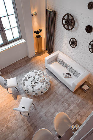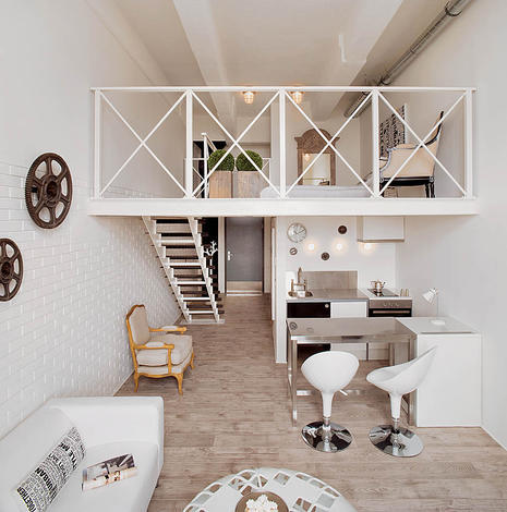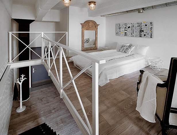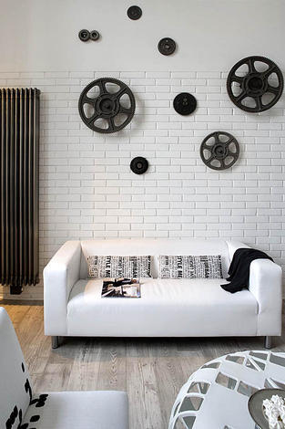 Misz-masz stylów. Począwszy od mebli stylu ludwikowskim a na ikonach designu skończywszy. motyw przewodni: kolor biały. Dzięki wykorzystaniu białej, drewnianej barierki wnętrze nabrało lekkości i przytulności i stylistyki typowej dla wnętrz skandynawskich. Idealnie w styl wnętrza wpasowuje się biała cegła położona na jednej ze ścian. O tym, że jest to wnętrze industrialne przypominają czarne koła w różnych rozmiarach powieszone w salonie, kuchni i łazience. W tej ostatniej pełnią dodatkową funkcję – wieszaków na ręczniki. Są to zapewne jakieś elementy maszyn włókienniczych, ale to tylko moje przypuszczenia. W poprzednim lofcie projektantka zaznaczyła związek wnętrza z obiektem starej fabryki za pomocą tapety i nietypowych nóg biurka w gabinecie.