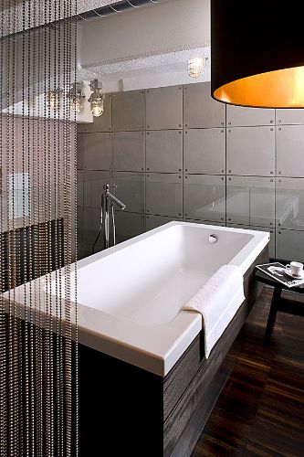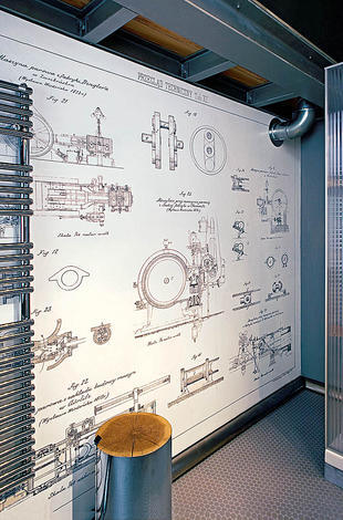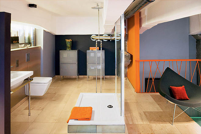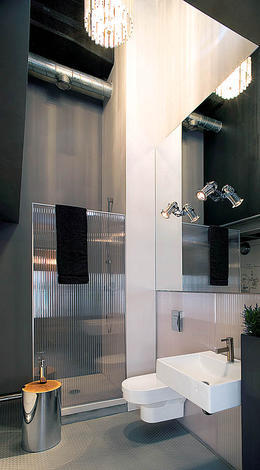 W łazience wstawiono kabinę prysznicową, której osłona jest wykonana z poliwęglanu. Jedna ze ścian łazienki została ozdobiona tapetą przedstawiającą detale starych maszyn włókienniczych, które odbijają się w ogromnym lustrze, które również osadzone jest w płytach z poliwęglanu.