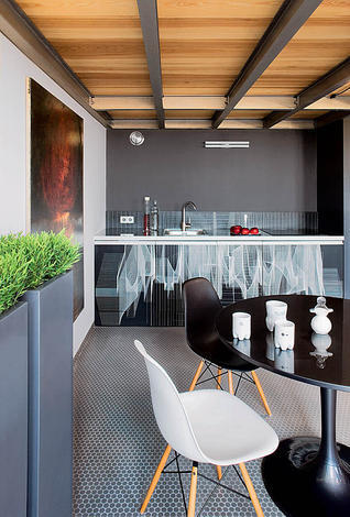 Surowa kuchnia wykonana jest w całości ze sklejki polakierowanej bezbarwnym lakierem. Ciekawym pomysłem, który nadaje charakteru kuchni, jest oryginalna zasłona, zrobiona z siatki metalowej za którą znajdują się kamienie rzeczne. Szary blat wykonany jest z konglomeratu.