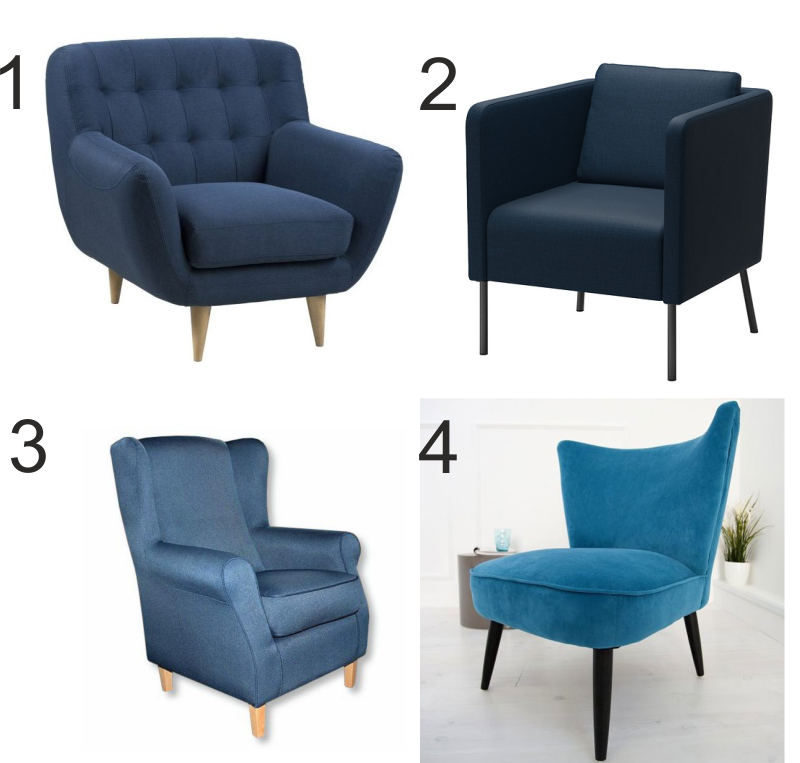Do chłodnych jasnych, beży dobierzemy dodatki w kolorze granatu. Najpierw poszukajmy jakiegoś fajnego fotela w kolorze granatowym. Pokaże Wam 4 propozycje. Zgadnijcie, który wybrała Pani Aurela?