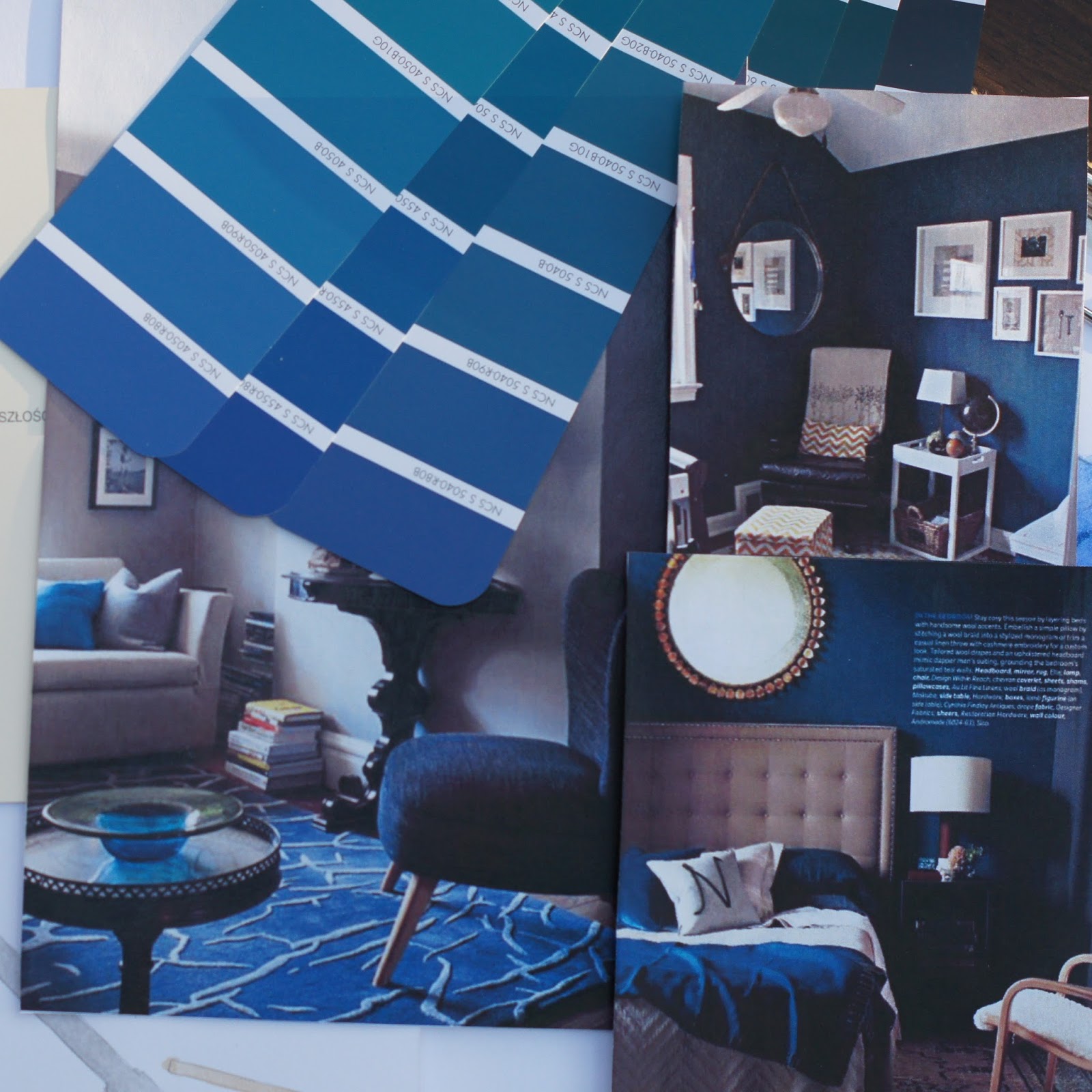 W końcu zdecydowałam się na dwa kolory ścian: granatowy S 5040-R80B – ściana przy której będzie stało łóżko oraz chłodny beż – Powabny diament z palety farb Magnat. A cała paleta kolorystyczna wnętrza przedstawia się tak: