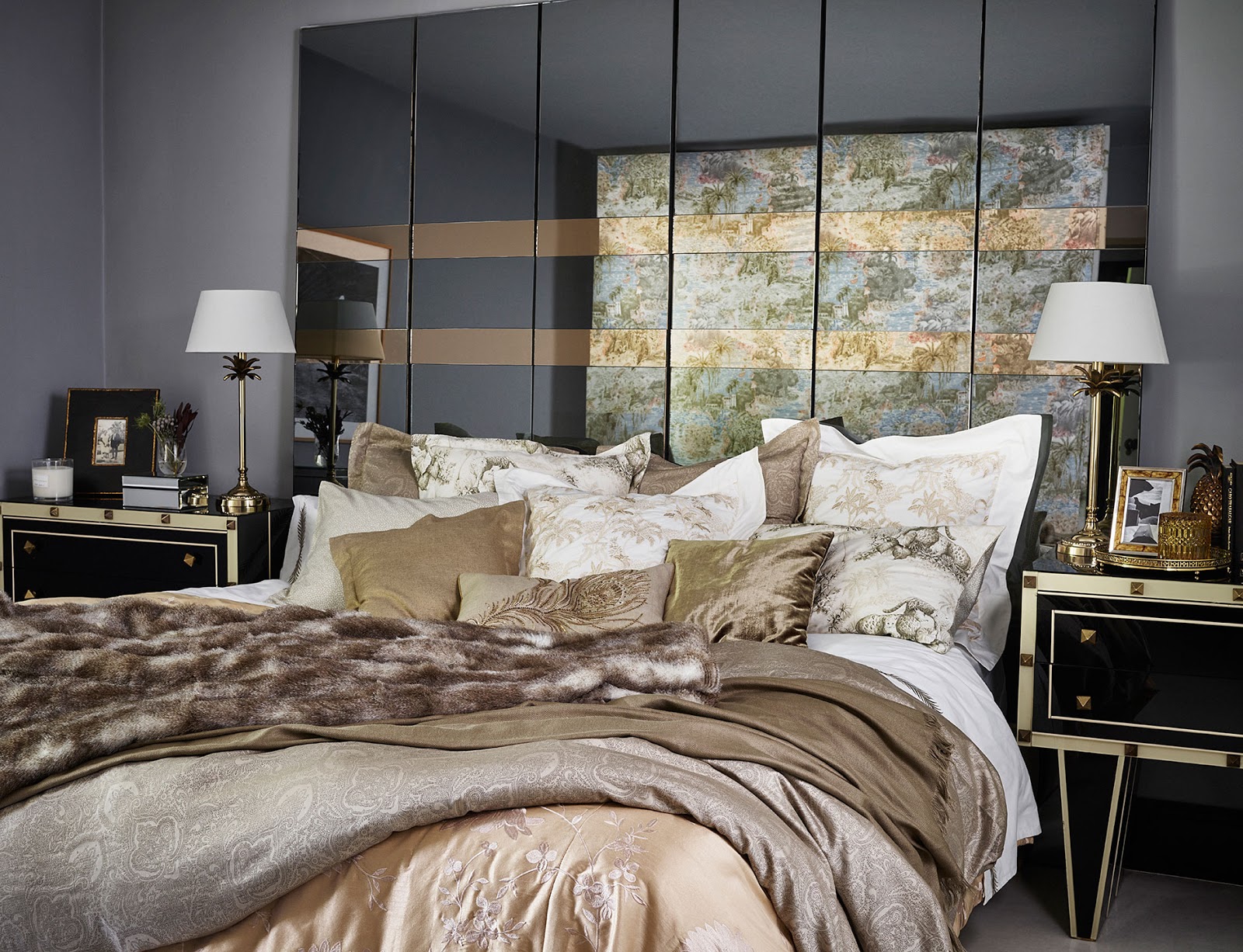 2) W sypialni króluje aksamitny blask i ciepły welwet. Odcienie złota, beżu na tle grafitowej ściany oraz luster prezentują się wspaniale.