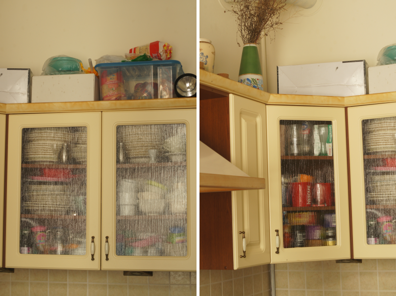 Tym razem nie ograniczałam się tylko do malowania. Postanowiłam urozmaicić trochę ich wygląd i dodać samodzielnie wykonane dekoracje w postaci szprosów czyli listewek drewnianych dzielących szybę. Tak wyglądały moje szafki przedtem:
