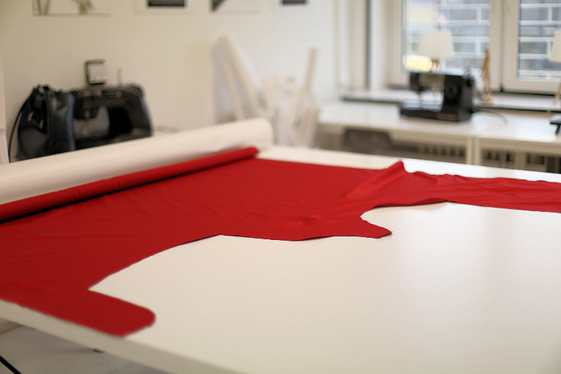 Zanim zabierzemy się za szycie, trzeba za pomocą szpilek upiąć zakładki. Wszystko wyjaśnione jest dokładnie na szablonie. Przed zdjęciem papierowego szablonu warto naciąć na tkaninie miejsca, w których powinny być zakładki.