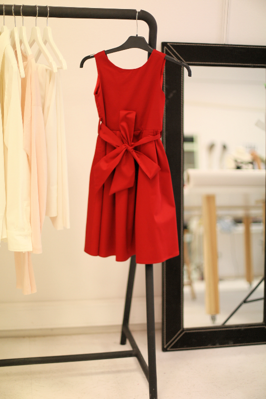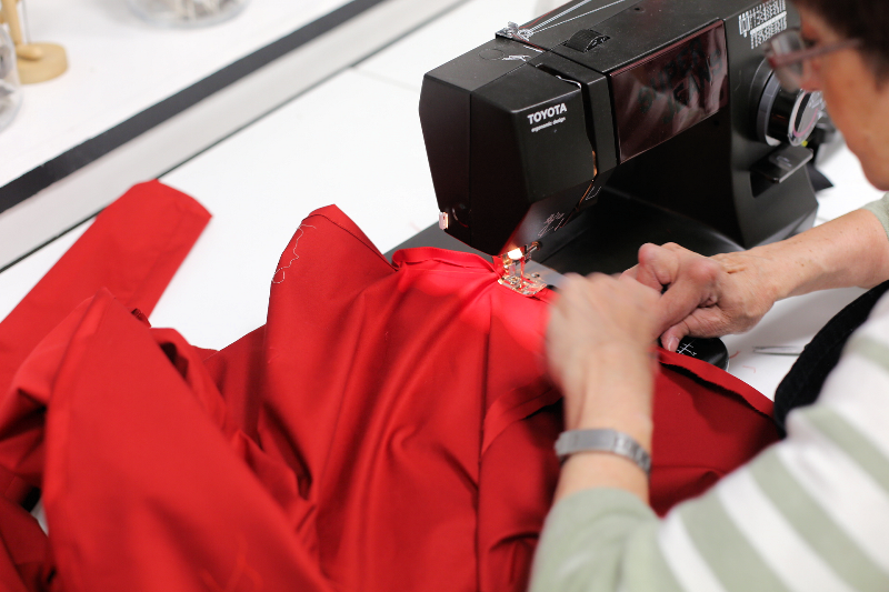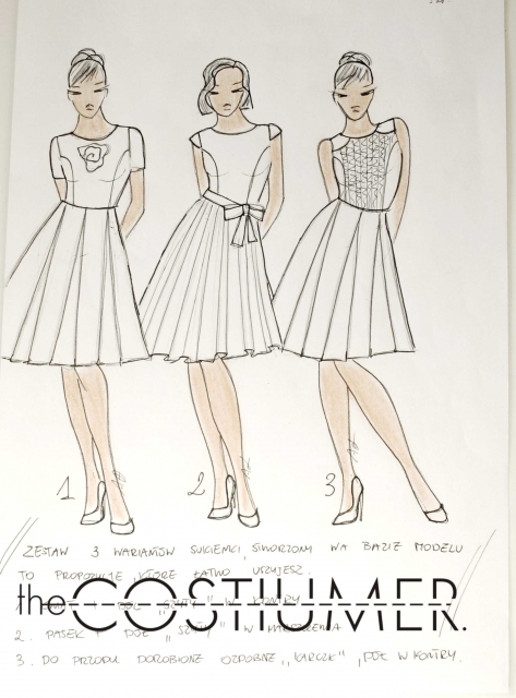 - Łączymy tył sukienki z przodem, nie zapominając o wszyciu paska.