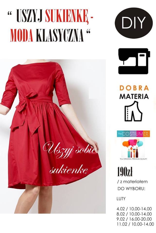 Chcecie uszyć taką sukienkę? Trzeba kupić ok 2mb materiału (ok. 60zł). Jeśli planujecie bardziej skomplikowany wzór z kieszeniami i na przykład z różą, to polecam zaopatrzyć się w 2,5mb bo 2mb ledwo starcza na najprostszy model. Ja szyłam z bawełny z minimalną domieszką lycry. Suwak kryjący (1zł). A na koniec wybrać jeden z szablonów sukienek zaprojektowanych przez Agnieszkę (58,90zł). Mój szablon (—-> tutaj) to właściwie możliwość uszycia aż trzech sukienek: z różą, szarfą oraz zdobionym przodem.